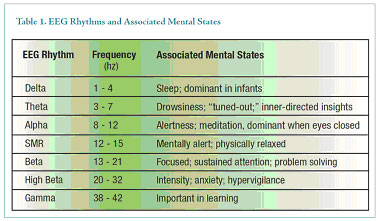 relaxed wakefulness (Alpha, 8-12 Hz), and finally to very fast activity which characterizes the activated, problem-solving mind (Beta, 13-21 Hz). The brain also shows a Sensory-Motor Rhythm (SMR 12-15 Hz) which is important in the acquisition of information and is active during mental alertness and muscular relaxation. EEGs that demonstrate very fast activity (High Beta, 22-36 Hz) point to problems with anxiety and even obsessive compulsive disorder. On the other hand, an even faster frequency brainwave, called Gamma (38-42 Hz) is important for intense problem-solving and learning (see Table 1).